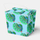 Party favour box shown in light blue with a cute cartoon peacock print.