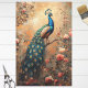 A graceful and elegant painting featuring a majestic peacock adorned with iridescent blue and green feathers, beautifully contrasted by delicate blush pink roses. The peacock’s plumage cascades in intricate detail, shimmering with hints of gold and teal, while the soft, romantic roses weave through the scene, adding a touch of vintage charm.