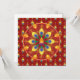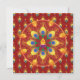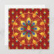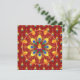 Pattern behind the Rangoli: single peacock's feather with little Diya lamps on crimson red background.