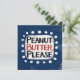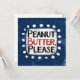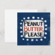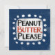 "Peanut Butter, Please" is a cute text design in blue with black and red text, along with a white accent shape and white textured whimsical dots surrounding it.