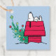 Enjoy this Peanuts holiday design featuring Snoopy sleeping on his dog house beside his Christmas tree.