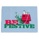 Enjoy this Peanuts holiday design featuring Snoopy sleeping on his dog house beside his Christmas tree.