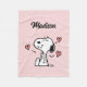 Looking for a gift that feels truly special? Take this adorable Snoopy blanket to the next level by adding a custom name!. This custom fleece allows you to pair your loved one's name with the world's most affectionate beagle in a stylish script font. With Snoopy clasping his paws in joy and floating hearts all around, it’s a one-of-a-kind present that says, "This hug is just for you."
