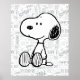 This Peanuts artwork features Snoopy sitting on background of black and white Charles M. Schulz comic strips.