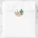 This circular Peanuts sticker features a humourous, non-traditional holiday scene set in a desert or arid landscape with a pale pink/tan ground. Snoopy, wearing a cowboy hat, is shown holding an electrical plug, connecting a string of colourful Christmas lights that are already draped around a large saguaro cactus. This officially licensed sticker is a fun, Southwestern-themed piece of seasonal merchandise, perfect for celebrating a warm-weather Christmas, decorating gifts, or adding a unique touch of Peanuts charm to any item.