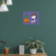 Spike, with his signature droopy moustache and thin frame, wears a slightly worn-out hat that adds to his desert-dweller charm. The jack-o'-lantern has a crooked smile, with uneven teeth and triangle-shaped eyes, looking mischievously spooky. The cactus stands tall behind the pumpkin, adding a bit of that desert flair to the scene, almost like it's a part of the Halloween celebration itself.