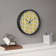 The size of the clock is dramatic and the abstract alcohol ink design is soothing and intricate at the same time. I chose the black frame that adds pop to the blue and gold design. The gold printing would be better in a slightly darker or larger font. I love it and I’m looking for just the right place in ny new apartment. I would recommend this clock for a personal gift or a present. I feel that the quality is excellent for the money! I’m a bit of a clock nut so I’m pretty particular about my purchases. The clock is larger in diameter than many if the clocks I have, so it stands out very well. I think a slightly darker printing color and a moderately larger size would best suit a professional decor or add more impact in a work place item.