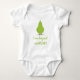 A food baby outfit bodysuit that has the positive food pun: “I am beyond comPEAR,” and features a cute, smiling, green, pear cartoon character.