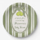 Pear sage green retro stripes baby shower personalized paper plates, retro oval frame hand drawn preppy bow pear baby shower monogrammed paper plates, hand written whimsical baby shower personalized paper plates, pear baby shower party supplies personalized baby shower table decor