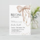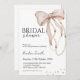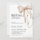 Elegant white bridal shower invitation featuring a white bow and pearl embelishments.