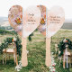 Wedding hand fans. Beautiful design with an orange butterfly touching white heart-shaped pearl beads. Another butterfly blends into the bouquet of light orange and pink roses. Orange is the theme colour on the parchment paper image. Convert this for any occasion. Add a photo and/or change the text.