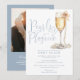 This dusty blue elegant script pearls and prosecco bridal shower invitation can be personalised with all your special event information and photo and registry QR code on the reverse. Designed by Thisisnotme©