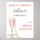 A welcome sign for a birthday party. A chic white background. Decorated with a a glass of pink bubbles and pearls. Personalise and add a name. Black and golden letters.