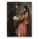 A young girl is selling flowers in Romania from the info. She wears a scarf and long dress. It is heavy to hold that way.