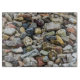 Close up photograph of pebbles on a beach printed on a glass chopping board.