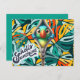 Peeking through a zipper is a vibrant toucan, its colourful beak and bright eyes adding a touch of the tropics. Background of colourful exotic leaves completes the tropical theme and complements the toucan's vibrant colours. Fun typography "Hello Sunshine" adds a friendly touch and reinforces the positive vibe of the design.