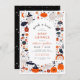Peek a boo! This super-cute design features a frame of spooky friends and elements: ghosts, pumpkins, spiders, an owl, bats, magical flowers, candy, a crystal ball, moons, stars, and more! Inside the border, "peek a boo!" is written curved over the other text in lowercase letters. This play on words is perfect for Halloween! Your event details appear underneath that in simple typography, with the parents' or mum-to-be's name(s) in script lettering. Cards reverse to starry night sky pattern against a black background. Feel free to contact me if you have any questions or would like a custom-made design!