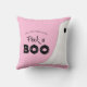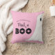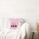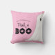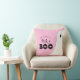 A cute ghost peeks out from the edge of the pillow. "Peek a BOO" text in fun handwritten style fonts. Shown in colours of pink, white, and black, but all colours are editable - background, text elements, and ghost (just be sure to edit both sides). Personalise the curved text with a family name, etc. © Kimbellished, LLC