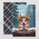 This adorable holiday greeting card features a cute Corgi Dog illustration wearing a festive crown wreath of winter florals, holly, pine, and berries, with snowflakes gently falling against a Winter Wonderland Snowy Forest. The Corgi is peeking over the snow-capped log to say hello! The playful text "Merry Holiday Wishes" adds a warm seasonal greeting, and can be customised as you like. The reverse side is decorated with a classic plaid check, adding a traditional touch to the overall design. This cute, playful card is perfect for sending holiday cheer to family and friends, and the customisable name and date make it a personalised keepsake.