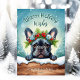 This adorable holiday greeting card features a cute French Bulldog illustration wearing a festive crown wreath of winter florals, holly, pine, and berries, with snowflakes gently falling against a Snowing Forest Winter Scene. The little Frenchie is peeking over the snow-capped log to say hello! The playful text "Warm Holiday Wishes" adds a warm seasonal greeting, and can be customised as you like. The reverse side is decorated with a classic plaid check, adding a traditional touch to the overall design. This cute, playful card is perfect for sending holiday cheer to family and friends, and the customisable name and date make it a personalised keepsake.