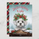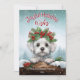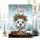 This adorable holiday greeting card features a cute Maltese Dog illustration wearing a festive crown wreath of winter florals, holly, pine, and berries, with snowflakes gently falling against a Snowing Woodland Forest Scene. The little Maltese is peeking over the snow-capped log to say hello! The playful text "Joyful Holiday Wishes" adds a warm seasonal greeting, and can be customised as you like. The reverse side is decorated with a classic plaid check, adding a traditional touch to the overall design. This cute, playful card is perfect for sending holiday cheer to family and friends, and the customisable name and date make it a personalised keepsake.