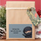 Adorable chubby yet fearsome looking little ninja is dressed in black outfit and carrying katana - traditional Japanese sword.