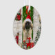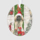 Pekingese Dog Christmas sitting outside decorated home with Christmas wreath, Christmas tree is a perfect Christmas gift idea for dog lovers.