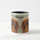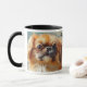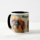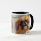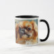 This cute mug celebrates the adorable Pekingese dog! Two sides of the mug have a beautiful portrait of a little Pekingese against a teal blue abstract background. At the centre is script that says Pekingese, but you may change it or even personalise it, if you wish.