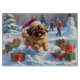 A fluffy Pekingese joyfully runs through the snowy landscape, wearing a festive red Christmas hat. This charming winter scene highlights the breed’s regal yet playful personality, capturing the warmth and spirit of the holiday season. A delightful design full of festive cheer.