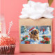 A fluffy Pekingese joyfully runs through the snowy landscape, wearing a festive red Christmas hat. This charming winter scene highlights the breed’s regal yet playful personality, capturing the warmth and spirit of the holiday season. A delightful design full of festive cheer.