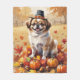 A watercolor-style painting of a cheerful dog sitting amidst a pile of vibrant fall leaves, surrounded by tiny pumpkins and scattered acorns. The dog wears a little pilgrim hat and beams with joy, capturing the spirit of Thanksgiving. In the background, soft harvest fields and golden-hued trees create a peaceful countryside ambiance. Gentle textures and warm, muted autumn tones give the scene a cosy, nostalgic feel perfect for celebrating the beauty of the season.