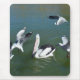 Pictured is a pelican swimming on the river with sea gulls crashing in on his treats