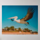 A pelican flying along the beach at Monkey Mia, Western Australia.