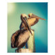 Couple of pelicans, probably still sleepy, pose at dawn, perched on pier posts.
