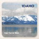 Looking east from Sandpoint, ID across Lake Pend Oreille (pond oh-ray) on a winter day; snow-covered mountains in the distance. Ice has formed at the shore and extends part way across the lake. Blues and greys are the predominate colours. Customisable text reading "IDAHO" also appears; and there is an additional place to add more text.