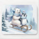 A polar bear and penguin are wearing earmuffs and scarves, joyfully riding a sled down a snowy slope in snowflakes.