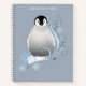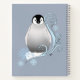 A cute baby penguin chick with snow and snowflakes in a light blue grey backdrop all drawn in an art nouveau style