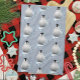 A cute baby penguin chick with snow and snowflakes in a light blue grey backdrop all drawn in an art nouveau style.