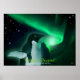 This adorable little Penguin poses before a striking green Aurora Australis on a distant Antarctic ice shelf.
