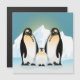 Family of penguins against the icebergs. Mom and dad penguin looking down at baby penguin, whilst he looks straight out.