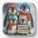 A charming penguin family stands together, each adorned with colourful knit hats and scarves and holding a fun sign.