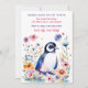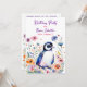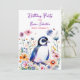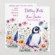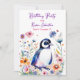 A cute penguin surrounded by pink, blue, orange and purple flowers watercolor illustration girl's birthday party invitations.
