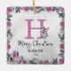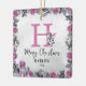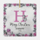 Cute kids monogram pink christmas ornament featuring a washed out grey background, elegant watercolor xmas florals & foliage, adorable baby penguins, snowman, gifts, the childs initial, name, year, and the festive greeting 'merry christmas'.