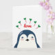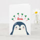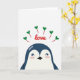 This greeting card features a soft, simple illustration of a small cartoon penguin in pale blue and cream standing along the lower part of the scene, looking upward with rosy cheeks and a tender, curious expression 🥰. Above its head, several green heart-shaped leaves with thin red stems float like little sprouting branches, creating a gentle canopy of affection. The penguin’s rounded shape and upward gaze suggest a quiet crush or a sweet friendship, as if it’s waiting for a warm sign from someone it cares about ❤️. The word “love” sits near the upper center, written in red and surrounded by the leafy hearts so your eye lands on it after following the penguin’s look. The lettering is smooth and flowing, and the red color matches the stems, tying the top and bottom together. A bright white background keeps everything airy and uncluttered, making the soft colors stand out without distraction. The overall layout feels balanced, with the penguin anchored below and the heart-leaves clustered above like a gentle shower. The green hearts and red stems hover around the red “love” near the top against the white space.