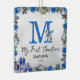 Cute baby monogram christmas ornament featuring a washed out grey background, elegant watercolor xmas florals & foliage, adorable baby penguins, snowman, gifts, the childs initial, name, year, the saying 'my first christmas', and the stats of the baby.