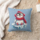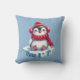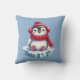 A cute watercolor penguin sitting on an iceberg wearing a red scarf, hat, and earmuffs with snowflakes.