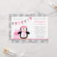 A cute winter wonderland birthday party invitation. Featuring a penguin, snowflakes, birthday cake and bunting banner. Makes a great invite for a winter themed girl birthday party. Shown in pink and grey.