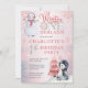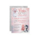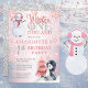 Cute watercolor penguin in a santa hat and snowman with snow falling all around "Winter ONEderland 1st Birthday Party". Design is in pink, grey, dusky blue, off black and white. Simply personalise with your child's name and birthday party details. Back features a silver-toned faux glitter background. Composite by Holiday Hearts Designs.