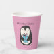 These personalised paper party cups are perfect for birthday parties and Christmas parties with their cute illustration of a penguin holding a wrapped present against a pink background. Use the fill-in-the-blank template field to easily personalise these party supplies with your own name or message.