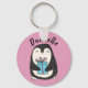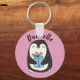 This adorable personalised keychain makes a great small personalised gift or stocking stuffer. These keychains also make great party favours for penguin-themed birthdays and holiday parties. This keychain features an illustration of a cute penguin holding a wrapped present against a pink background. Use the template field to personalise this keychain with a your own name or short message.